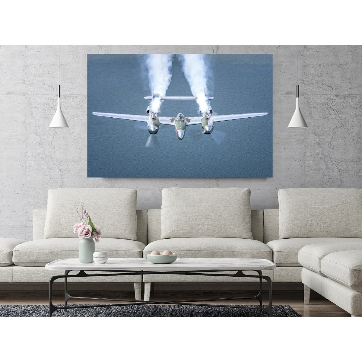 Image of P-38 Lightning printed on canvas and stretched on a wooden frame.