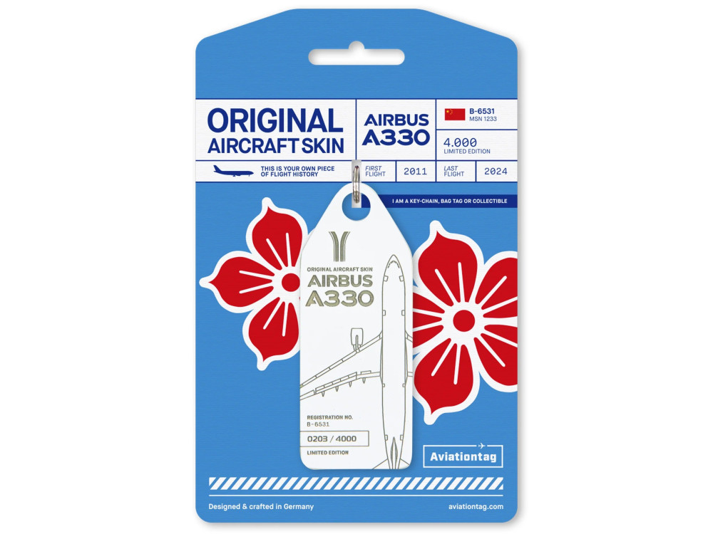 The China Southern A330 (B-6531) Aviationtag is not only a collector’s item but also a part of sustainable upcycling – tangible proof of how a retired airliner can be transformed into a meaningful keepsake. Add a genuine piece of aviation history to your collection and keep the spirit of this jetliner alive in your hands.