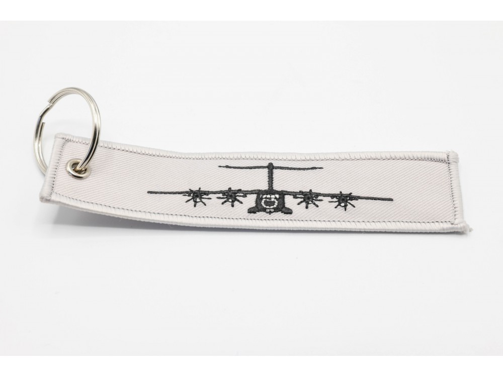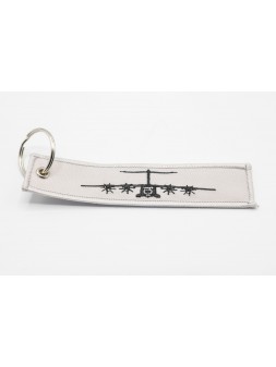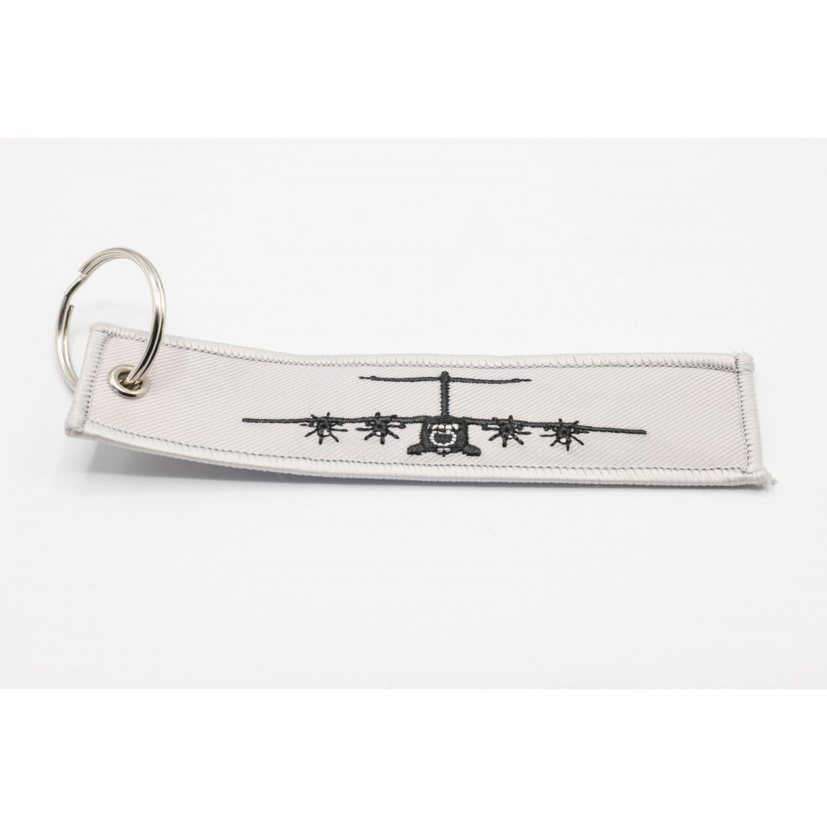 Fabric key ring double-sided embroidered, trimmed and finished with a metal wheel for hanging the keys.