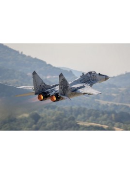 Obraz MIG-29 wydrukowany na płótnie typu canvas i naciągnięty na drewnianą ramę.  Foto obraz idealnie wkomponuje się w każde wnętrze. Kolorowe zdjęcia dodadzą uroku, rozjaśnią ale także zapełnią powierzchnię czystej ściany.  Autor fotografii: Michał Adamowski  Czas wysyłki zamówienia: 3 dni robocze