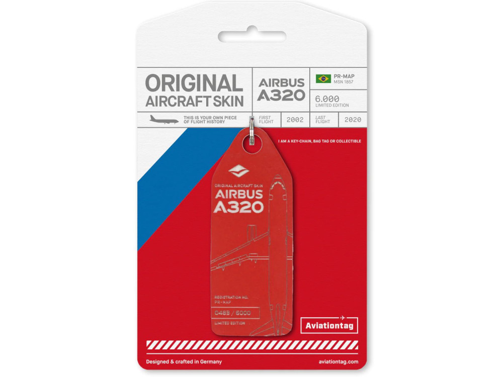 Od 2016 r. Airbus A320 PR-MAP był eksploatowany przez firmę Latam Brazil, po czym w 2020 r. został wycofany z eksploatacji i ostatecznie poddany recyklingowi w 2022 r. Teraz masz niepowtarzalną okazję stać się właścicielem kawałka historii lotnictwa z Ameryce Południowej. Każda przywieszka lotnicza została starannie wykonana z materiałów oryginalnego samolotu i niesie ze sobą historię i urok Airbusa A320 PR-MAP.