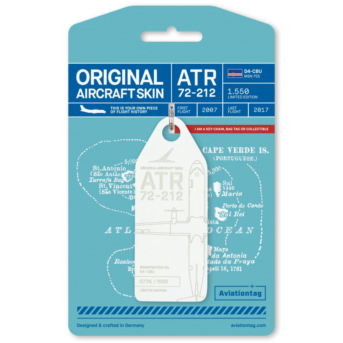 Początkowo nie planowaliśmy stworzenia kolejnej edycji ATR, ponieważ niedawno pracowaliśmy już nad kilkoma innymi ATR. Jednak gdy zobaczyliśmy żywe barwy D4-CBU, wiedzieliśmy, że musimy zdobyć jego fragment, aby wykorzystać go w Aviationtagach. Brelok powstał z oryginalnego fragmentu poszycia tego samolotu, który nosił także nazwę „Baltazar Lope” i miał jednoklasową konfigurację z 68 miejscami.