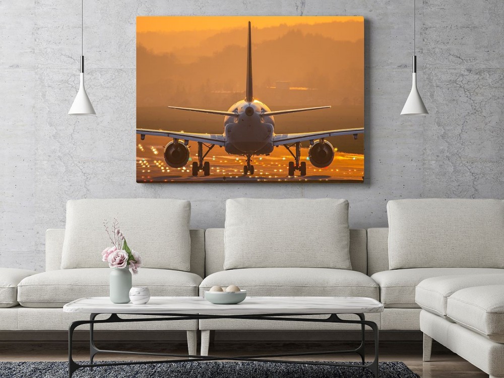 Obraz Zachód słońca na Balicach wydrukowany na płótnie typu canvas i naciągnięty na drewnianą ramę.