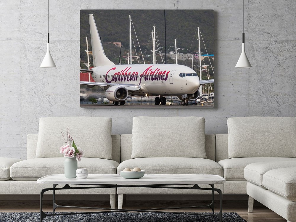 Obraz Caribbean Airlines na Saint Martin wydrukowany na płótnie typu canvas i naciągnięty na drewnianą ramę.