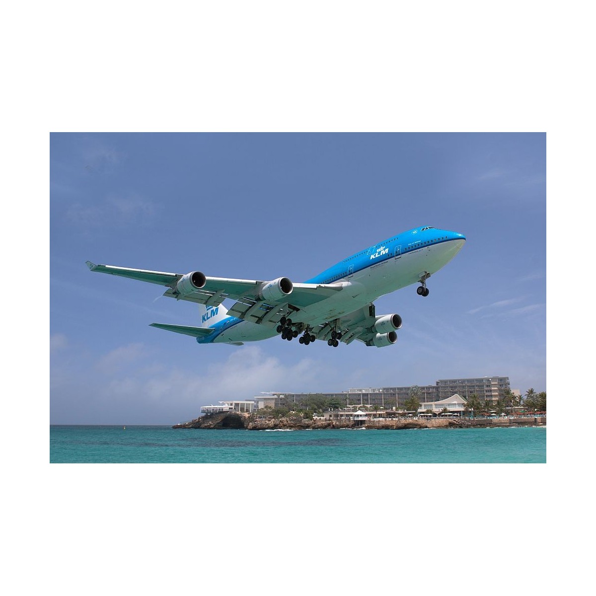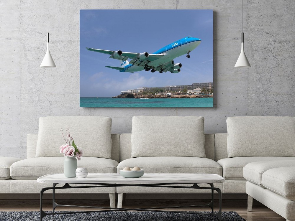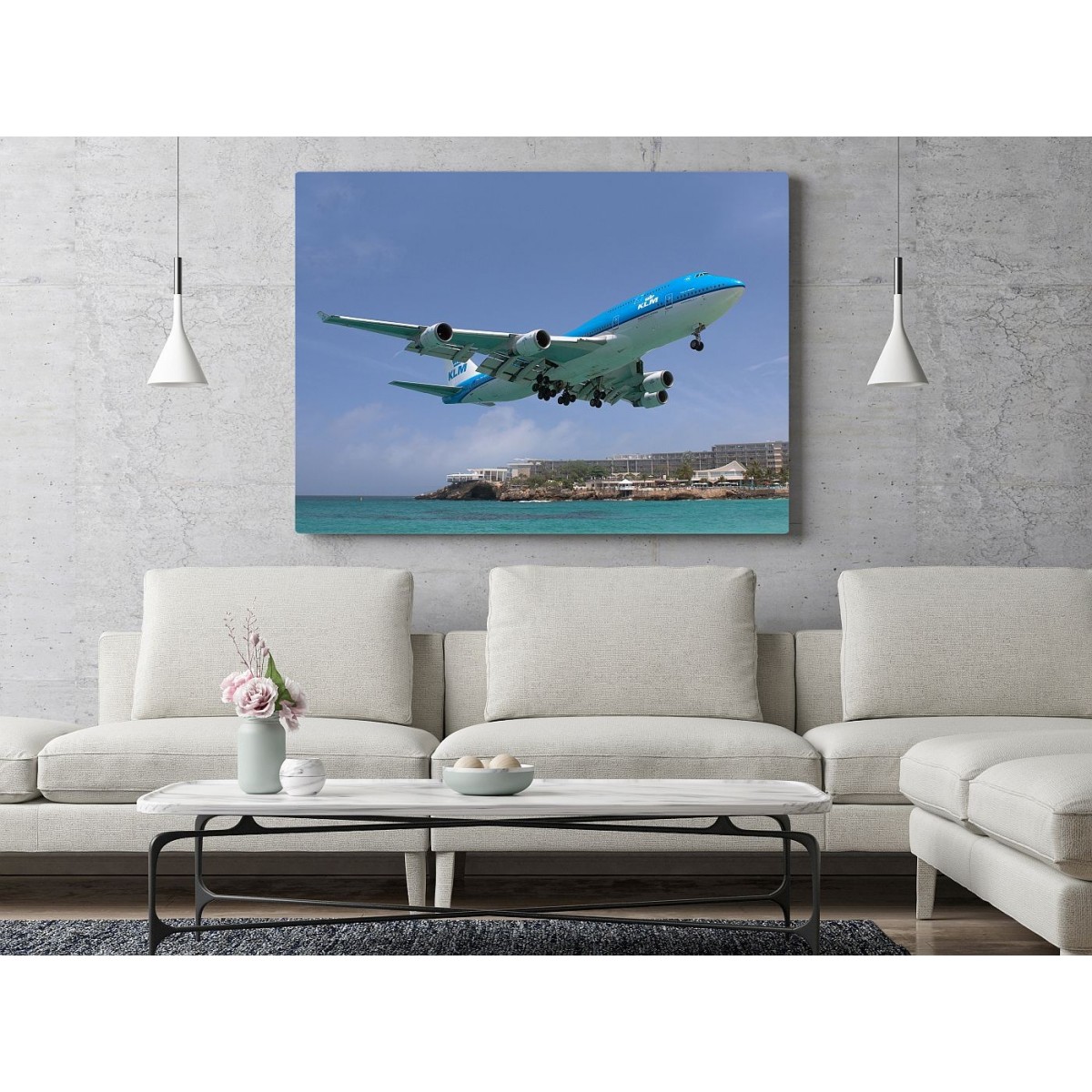 Obraz KLM Jumbo Jet na Saint Martin wydrukowany na płótnie typu canvas i naciągnięty na drewnianą ramę.