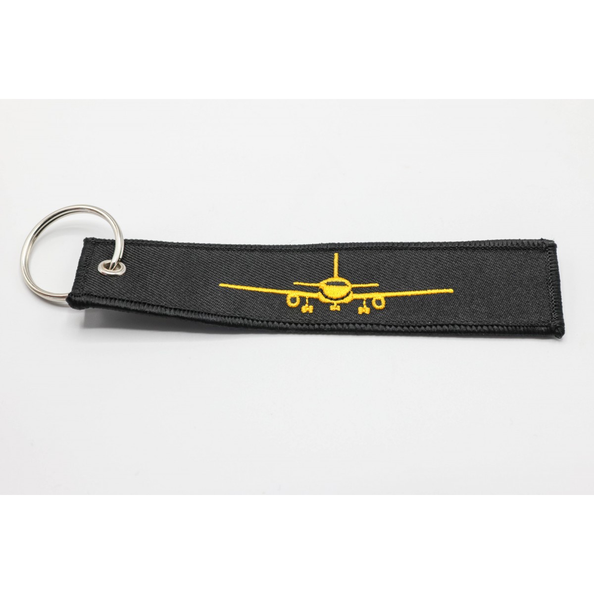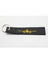 Materiałowy brelok do kluczy dwustronnie haftowany, obszyty i zakończony metalowym kółkiem do zawieszenia kluczy.