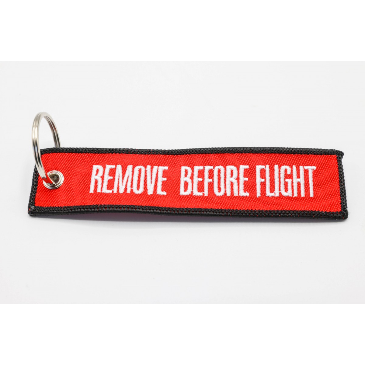 Materiałowy brelok do kluczy dwustronnie haftowany, obszyty i zakończony metalowym kółkiem do zawieszenia kluczy.