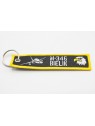 Materiałowy brelok do kluczy dwustronnie haftowany, obszyty i zakończony metalowym kółkiem do zawieszenia kluczy.