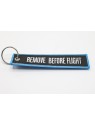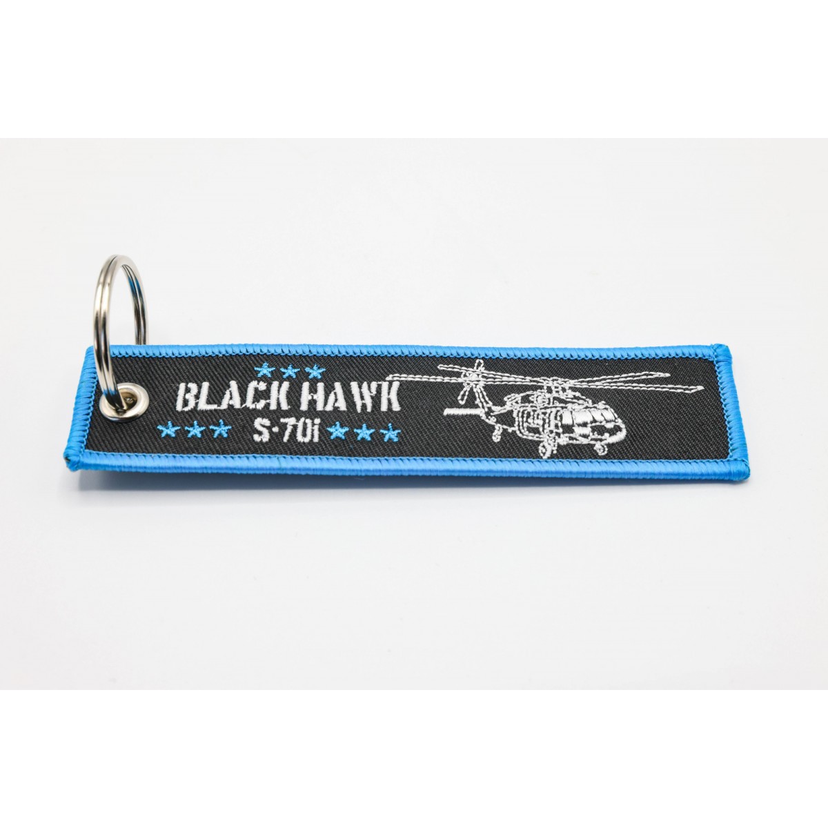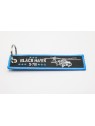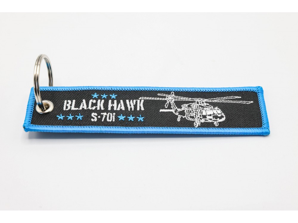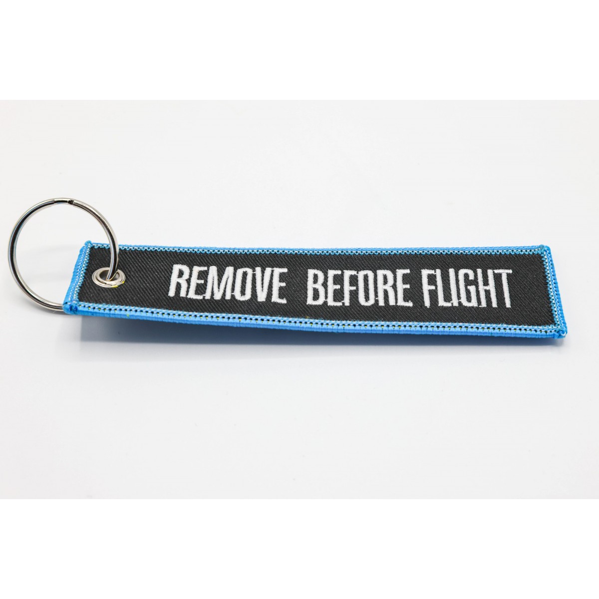 Materiałowy brelok do kluczy dwustronnie haftowany, obszyty i zakończony metalowym kółkiem do zawieszenia kluczy.