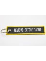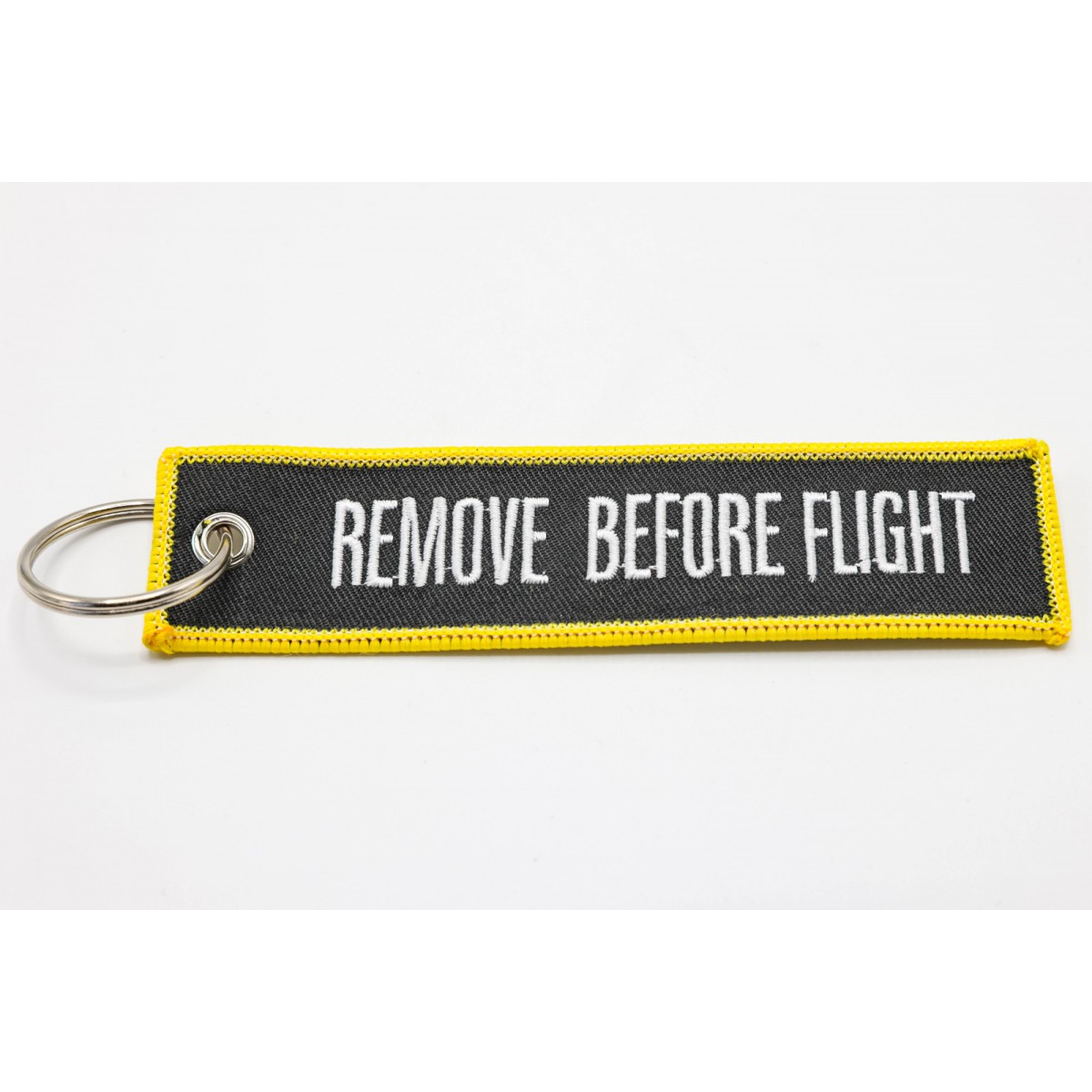 Materiałowy brelok do kluczy dwustronnie haftowany, obszyty i zakończony metalowym kółkiem do zawieszenia kluczy.