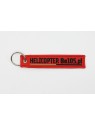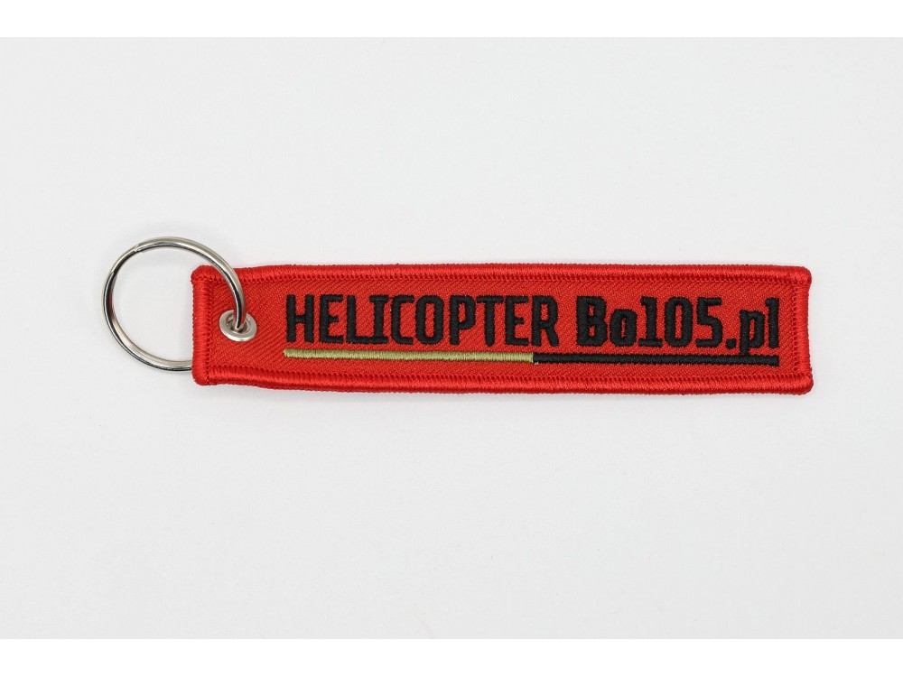 Materiałowy brelok do kluczy dwustronnie haftowany, obszyty i zakończony metalowym kółkiem do zawieszenia kluczy.