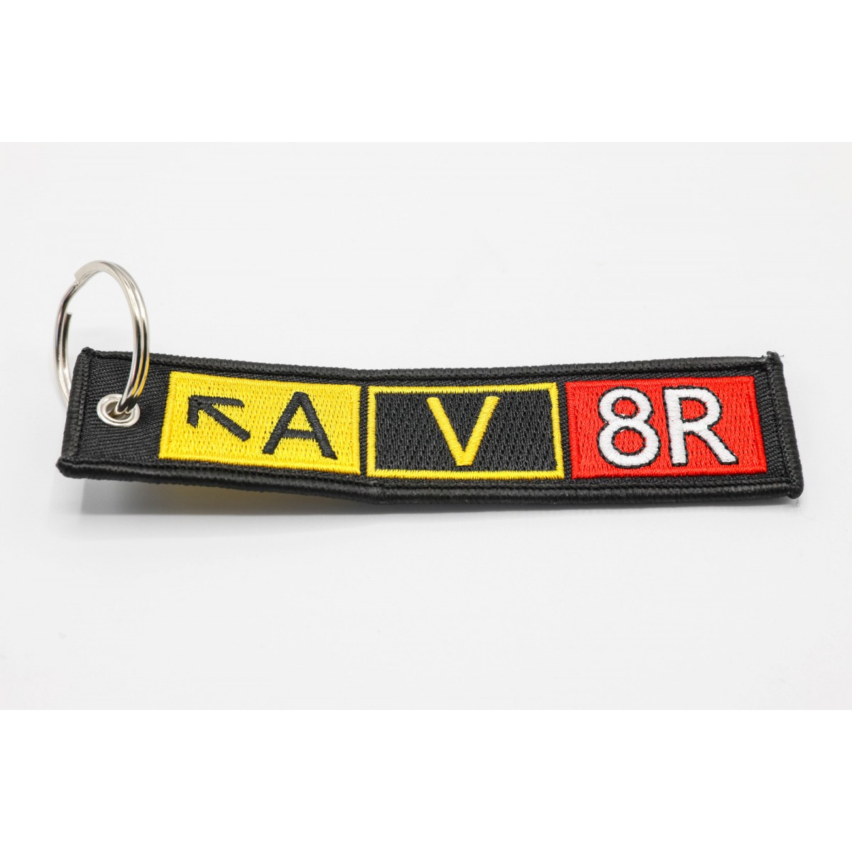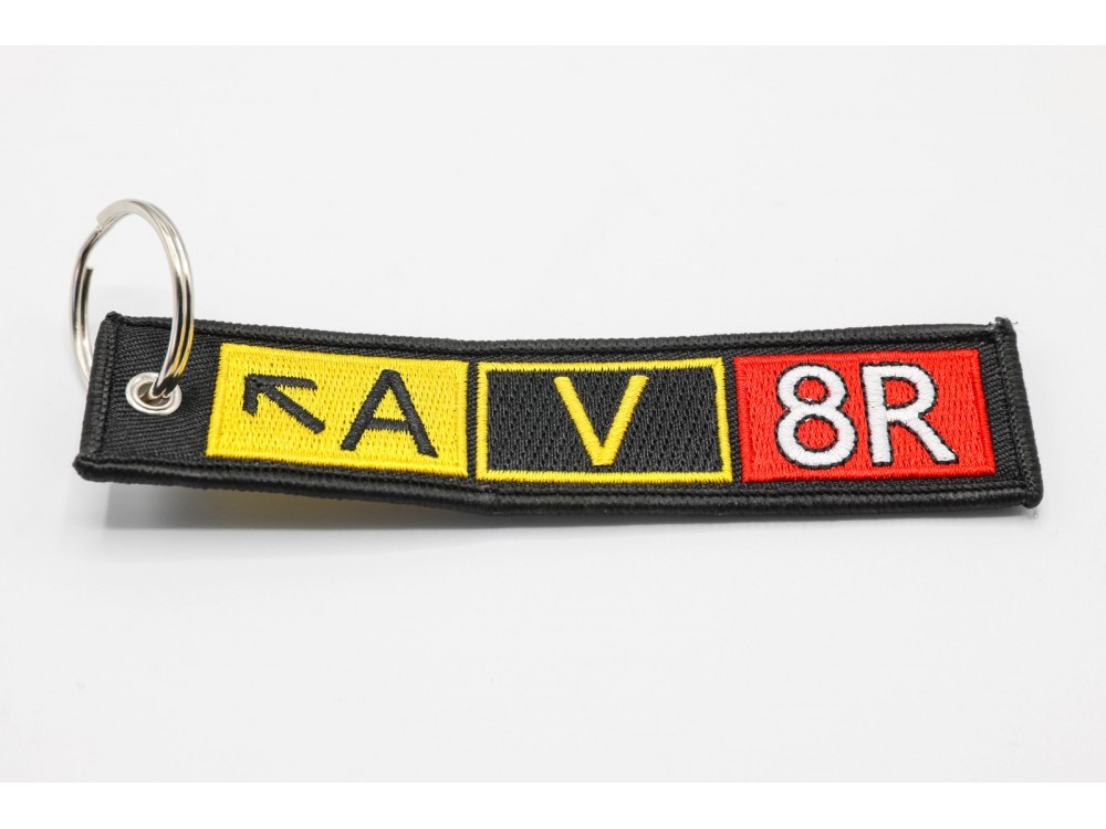 Materiałowy brelok do kluczy dwustronnie haftowany, obszyty i zakończony metalowym kółkiem do zawieszenia kluczy.