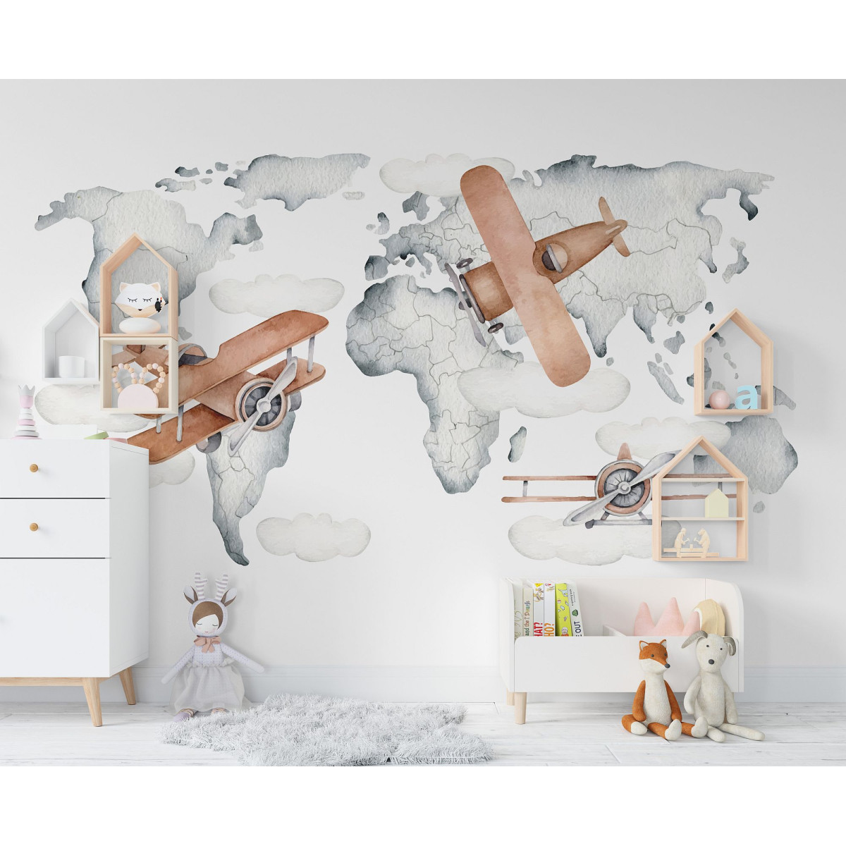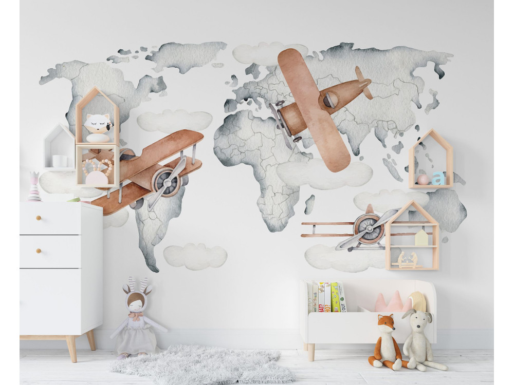Fototapeta tapeta do pokoju dziecięcego mapa świata i samoloty