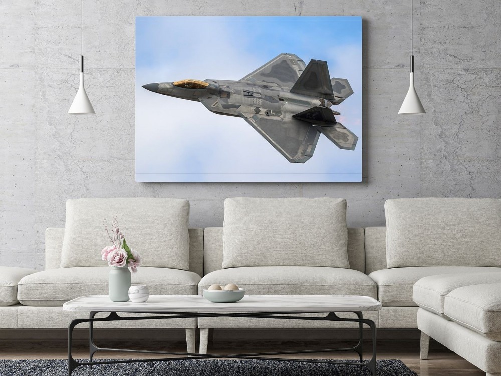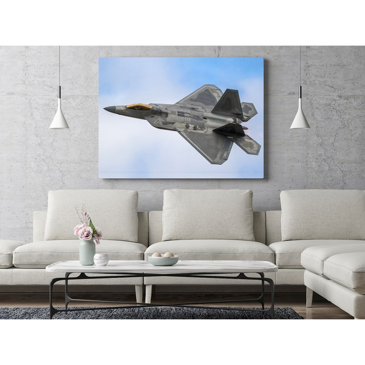 Obraz F-22 Raptor wydrukowany na płótnie typu canvas i naciągnięty na drewnianą ramę.