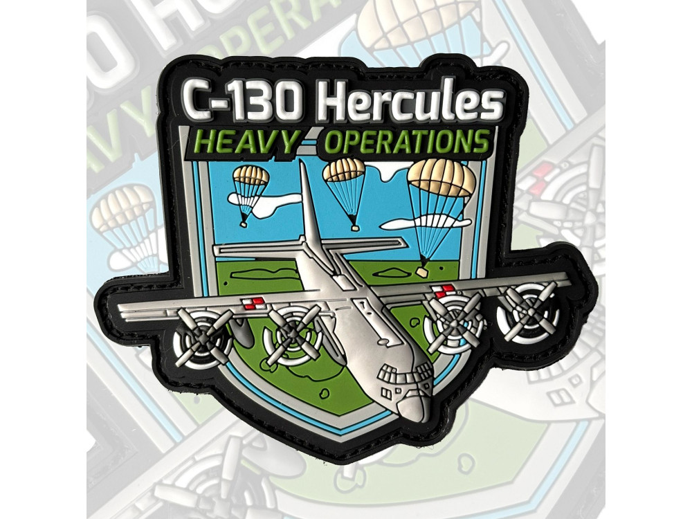Naszywka gumowa z samolotem C-130 Hercules. Rzep od spodu. Wymiar 10x8cm
